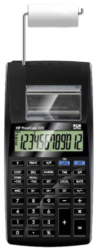 Stylish easy-to-use desktop calculatorProduct InformationIdeal for use in an office environment or accounting office the HP PrintCalc 100 Calculator has all the business functions you need plus printing capability. Quickly figure sales tax margin currency conversion grand totals and much more. The large 12-digit screen makes your work easy to view; the printer makes it easy to keep a permanent record.Product FeaturesLarge 12-digit angled displayPrints receiptsQuickly figure sales tax margins currency conversions and moreDo office tax or retail calculations with the intuitive layoutCarry with you in your backpack or briefcaseHorizontal design measures 7.9 x 3.8 x 1.7" (L x W x H)Battery or optional AC Adapter (6V/300mA AC Adapter not included)SpecificationsKeys and Switches:0-9 Number KeysDecimal Point KeyPower On / Clear Entry / Clear KeyPower OffArithmetic KeysEqual KeyPercentage KeySign Change KeyDecimal Point SelectorRounding Selector KeyGrant total KeyPaper Feed KeyData Printout KeyPrint Mode SelectorMemory Plus KeyMemory Minus KeyMemory Recall Key / Memory Clear KeyCurrency Exchange KeyExchange Rte Setting Key / Tax Rate Setting KeyAdd Tax KeyDeduct Tax KeySelling Price / Cost / Margin KeyIncludesHP PrintCalc 100 Printing Calculator4 'AA' Batteries * (AC Adapter Not Included)Printing Paper (starter size)User's Guide* NOTE: Batteries are included but not guaranteed.